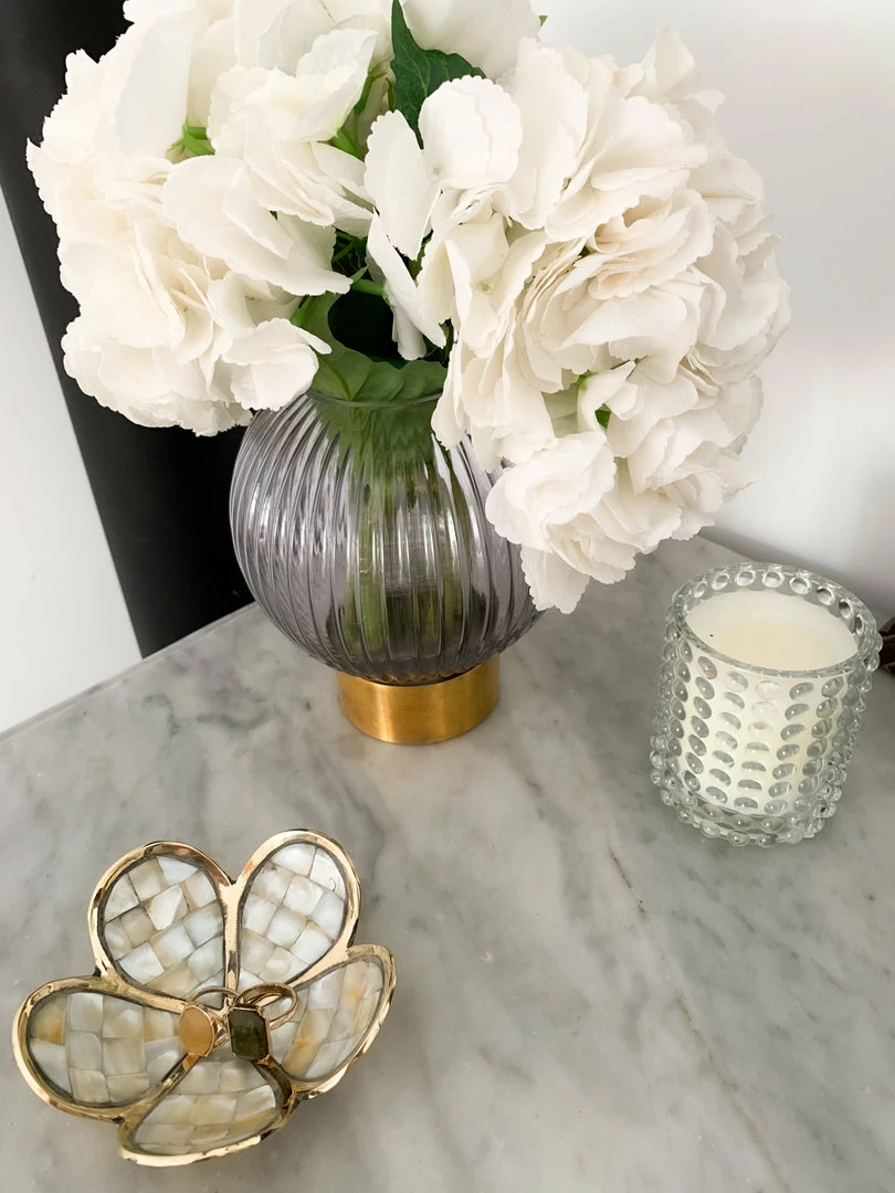 Make your home Insta worthy with this spherical vase. Made from smoked grey glass, this vase is in an intriguing orb shaped with a subtle ridged pattern. On a metal base in a gleaming brass hue, it will infuse any space with dash of glamour.