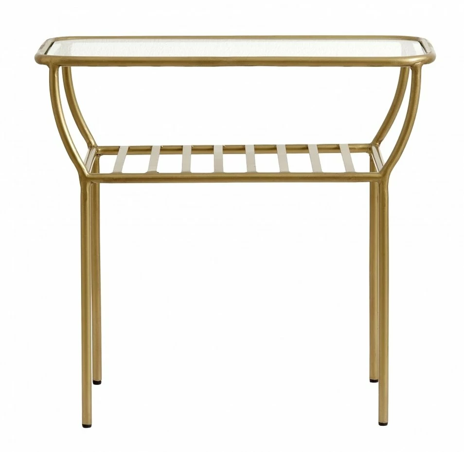 Composed of a transparent glass top and a ribbed shelf at the bottom, this table is ideal for arranging objects. Its solidity is ensured by its lacquered iron structure.