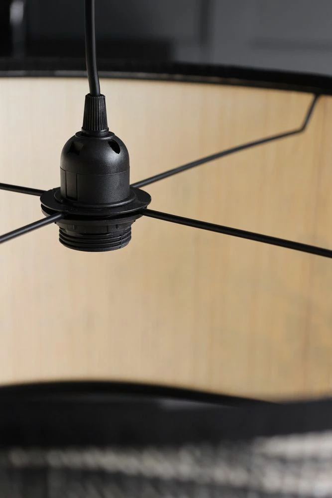 Finished in a sleek black rim on both the top and bottom of the shade, this bamboo shade comes with a wireframe, cord and black ceiling rose.