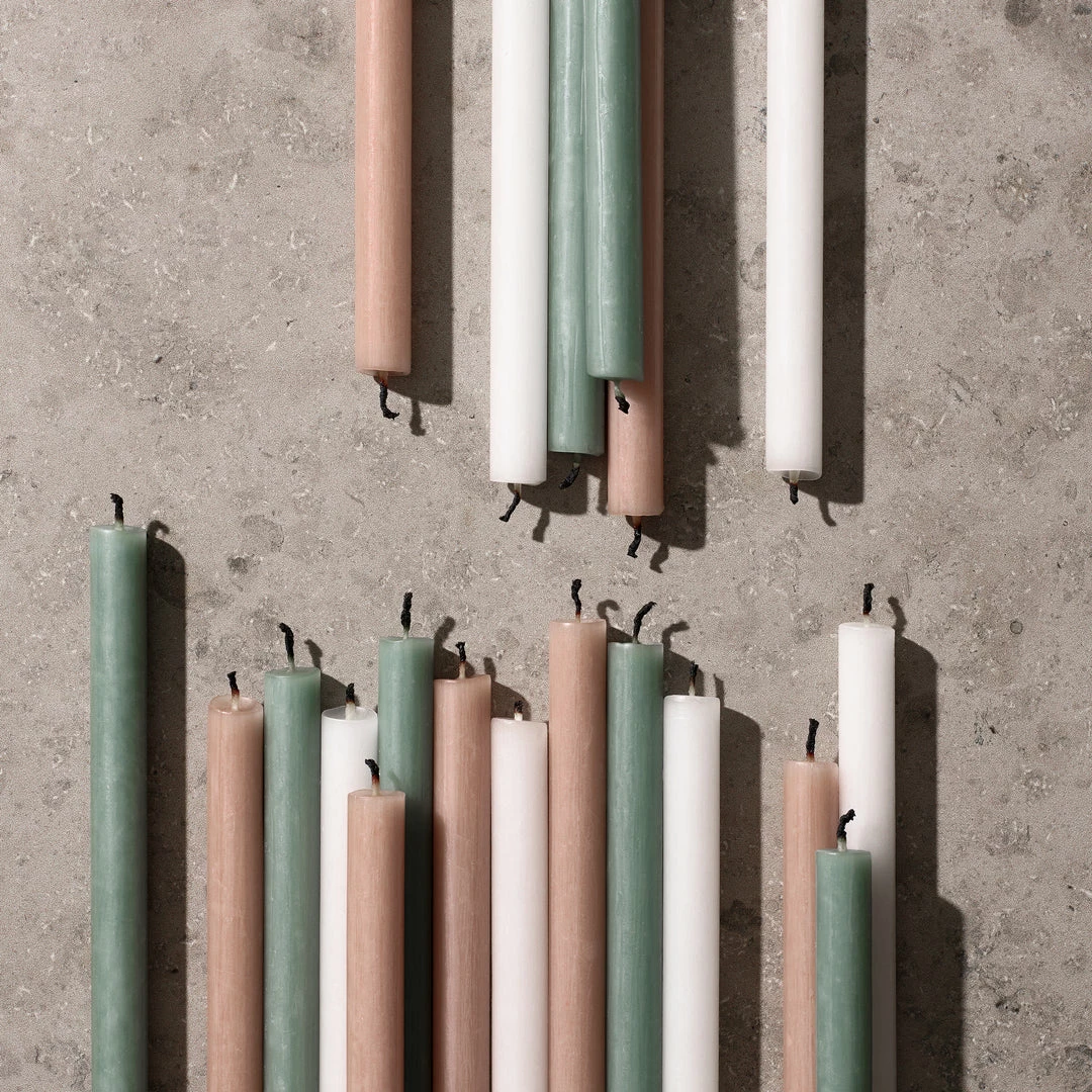 With its minimalistic and elegant form, the STOFF taper candles match the STOFF Nagel candle holder design beautifully. The candles are made of paraffin wax and are coloured all the way through for exclusive quality and a rustic look. The candles come in a box with 12 pieces and have an average burning time of 3.5 hours per candle.